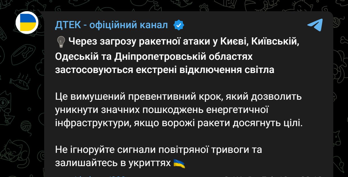 Через загрозу ракетної атаки у Києві, Київській, Одеській та Дніпропетровській областях застосовуються екстрені відключення світла.