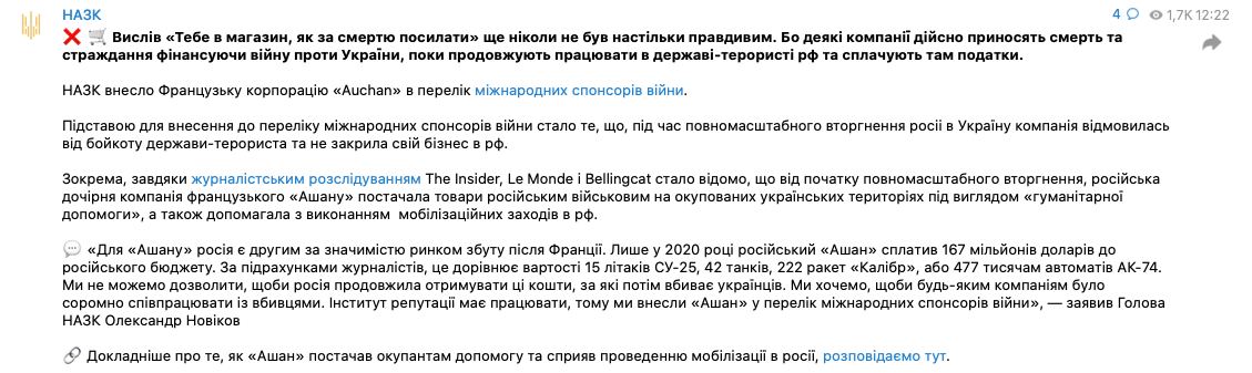 Національне агентство з питань запобігання корупції (НАЗК) внесло французьку мережу супермаркетів "Ашан" до переліку "міжнародних спонсорів війни". Підставою для такого рішення стало те, що під час повномасштабного вторгнення Росії в Україну компанія відмовилася закрити свій бізнес у Росії.