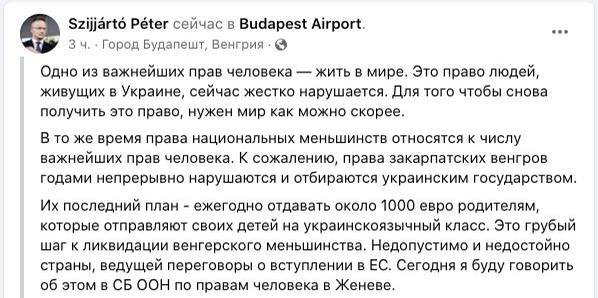 "Права закарпатських угорців роками безперервно порушуються та обмежуються українською державою. Їх останній план полягає в тому, щоб давати близько 1000 євро на рік батькам, які відправлять своїх дітей до класу української мови. Це грубий крок до ліквідації угорської меншини. Це неприйнятно та негідно країни, яка веде переговори щодо вступу до ЄС", - заявив Сійярто у Facebook.