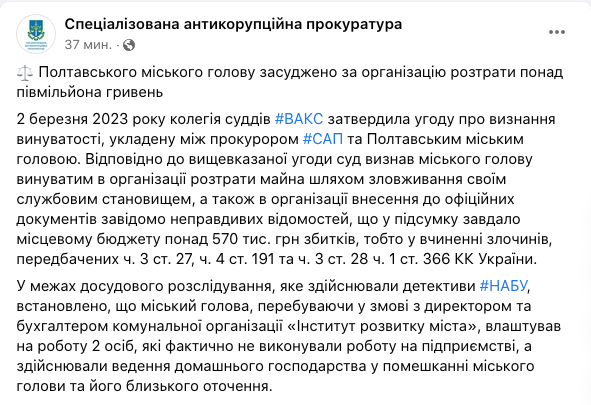 За версією слідства, у змові з директором і бухгалтером однієї з муніципальних організацій він влаштував на роботу двох жінок, які вели його домашнє господарство, а на підприємстві не працювали та отримали за це плату. Це спричинило втрату місцевого бюджету понад 570 тисяч грн.