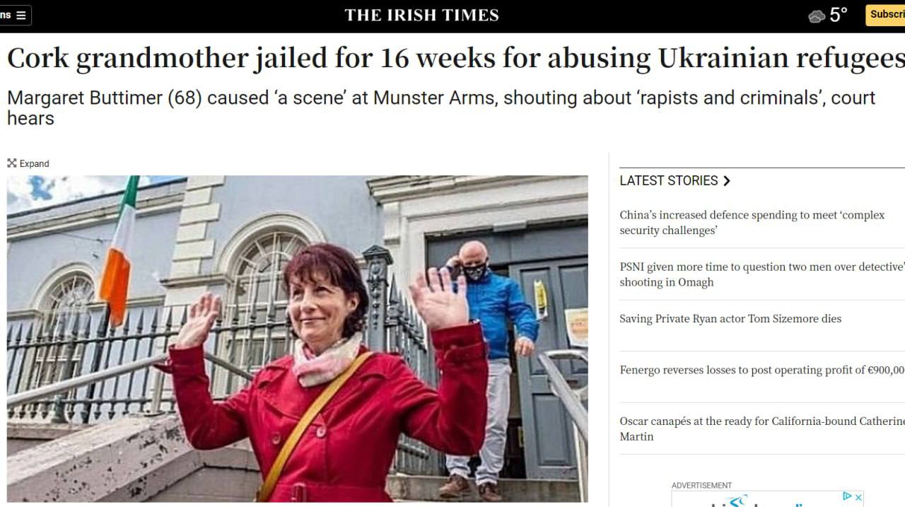 11.49 16 тижнів в'язниці отримала 68-річна ірландка Маргарет Баттімер за образу українців, які приїхали до Ірландії. Втім, суддя відстрочив вирок із умовою, що "бабуся з Корка" не наближатиметься до місць перебування українців.