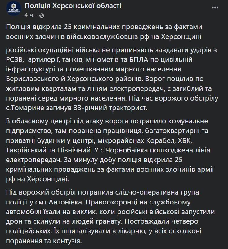 14.45 Під Херсоном четверо поліцейських зазнали поранень після того, як на них з дрона було скинуто гранату, повідомляє обласна поліція.