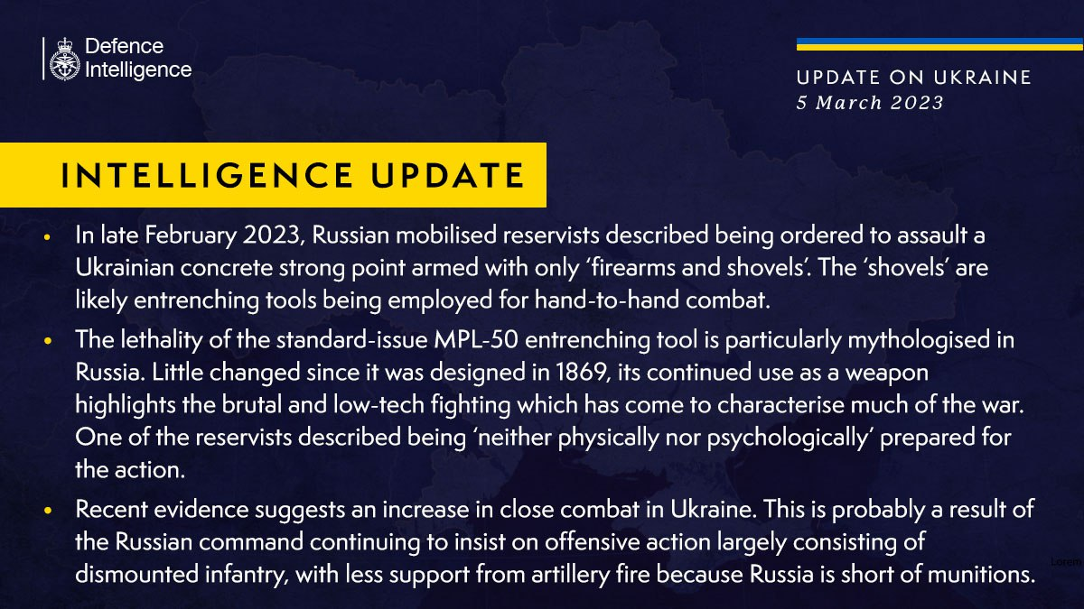 "Летальність штатної шанцевої зброї МПЛ-50 особливо міфологізована в Росії... її постійне використання як зброя підкреслює жорстокі та низькотехнологічні бойові дії, які стали характеризувати більшу частину війни", - заявляє британська розвідка.