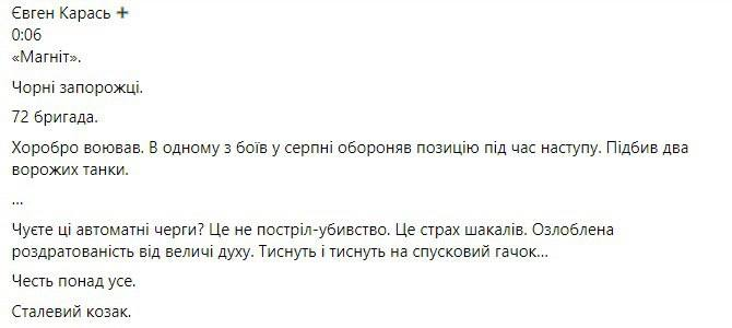 У мережі з'явилася інформація, що розстріляний військовий у формі ЗСУ на відео – це військовослужбовець 72 бригади "Чорних Запорожців" із позивним "Магніт".