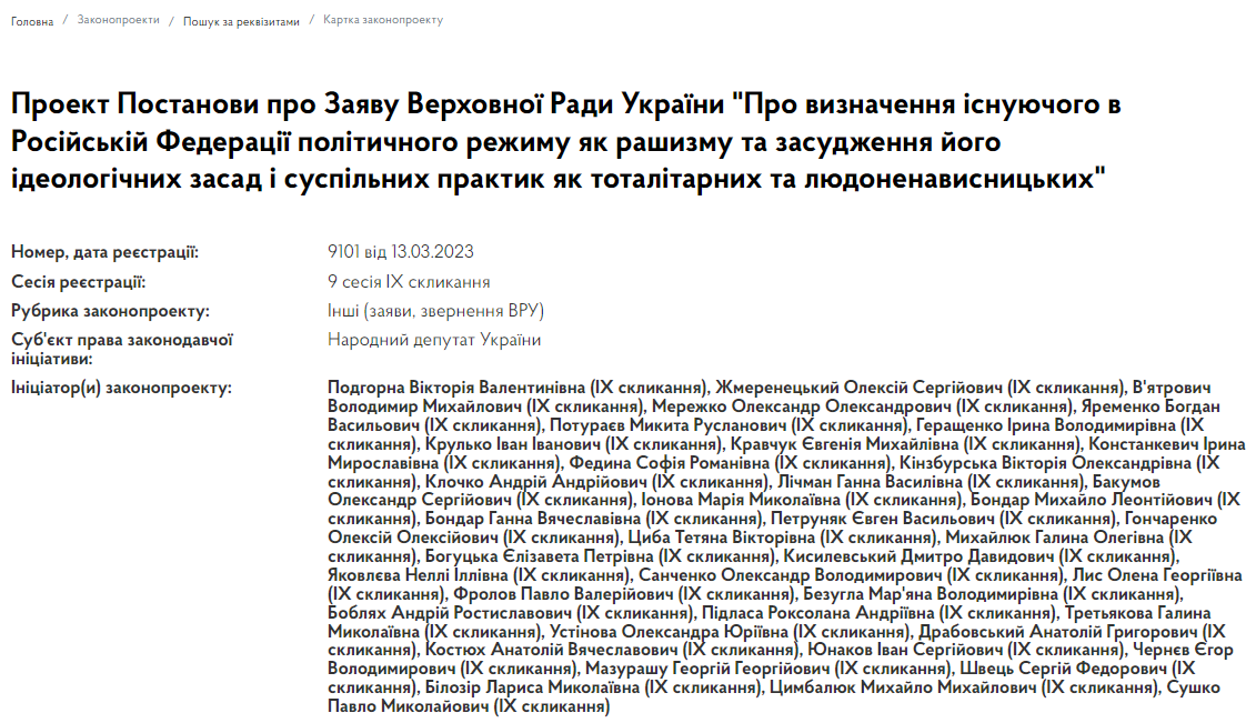 Заява називається "Про визначення існуючого в Російській Федерації політичного режиму як рашизму та засудження його ідеологічних основ та суспільних практик як тоталітарних та людиноненависницьких".