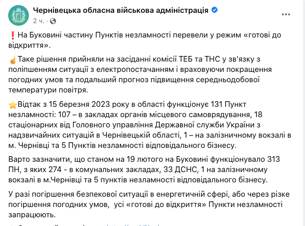 На Буковині закрили деякі "Пункти незламності" через стабільну ситуацію зі світлом та теплу погоду.