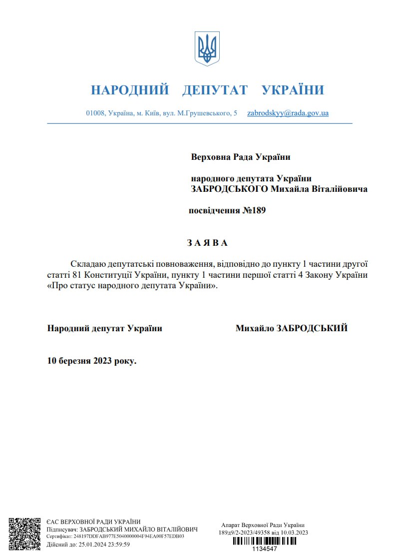 Народний депутат від "Євросолідарності" Михайло Забродський складає мандат.
