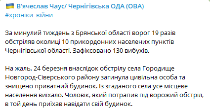 "За минулий тиждень із Брянської області ворог 19 разів обстріляв околиці 10 прикордонних населених пунктів Чернігівської області. Зафіксовано 130 вибухів", - написав він у телеграм-каналі у понеділок.