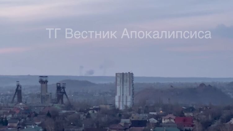 Відео знято здалеку, видно, як над містом піднімаються стовпи диму.