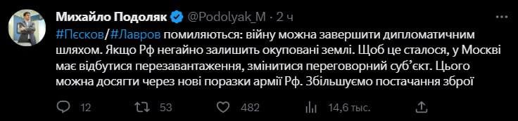 "Пісків/Лаврів помиляються: війну можна завершити дипломатичним шляхом. Якщо Росія негайно залишить окуповані землі. Щоб це сталося, у Москві має відбутися перезавантаження, змінитись переговорний суб'єкт. Цього можна досягти через нові поразки армії Росії. Збільшуємо постачання зброї", - написав Подоляк.