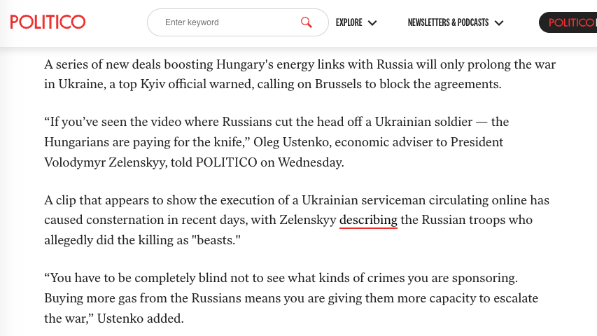 В Офісі президента України заявили, що поглиблюючи енергетичну співпрацю з Росією, Угорщина фінансово підтримує вбивства українців, зокрема страту полонених.