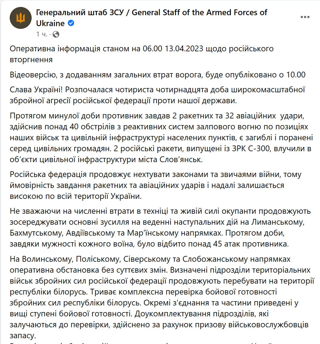 Війна в Україні триває вже 414 день. Ми слідкуємо за новинами 13 квітня у своєму онлайні.