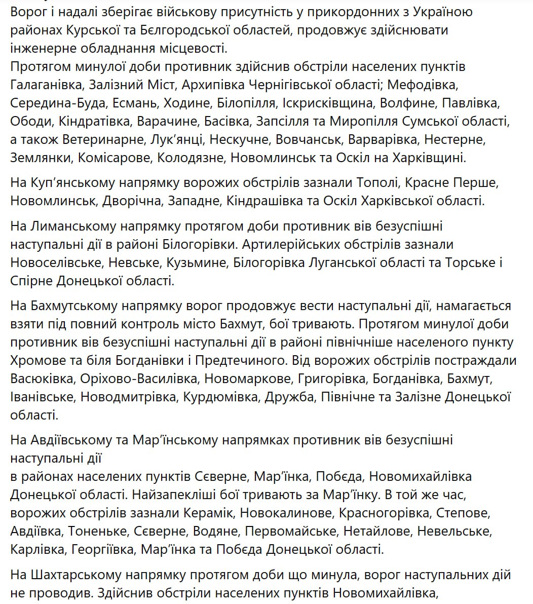 РФ продовжує зосереджувати сили на Лиманському, Авдіївському, Бахмутському та Мар'їнському напрямах.