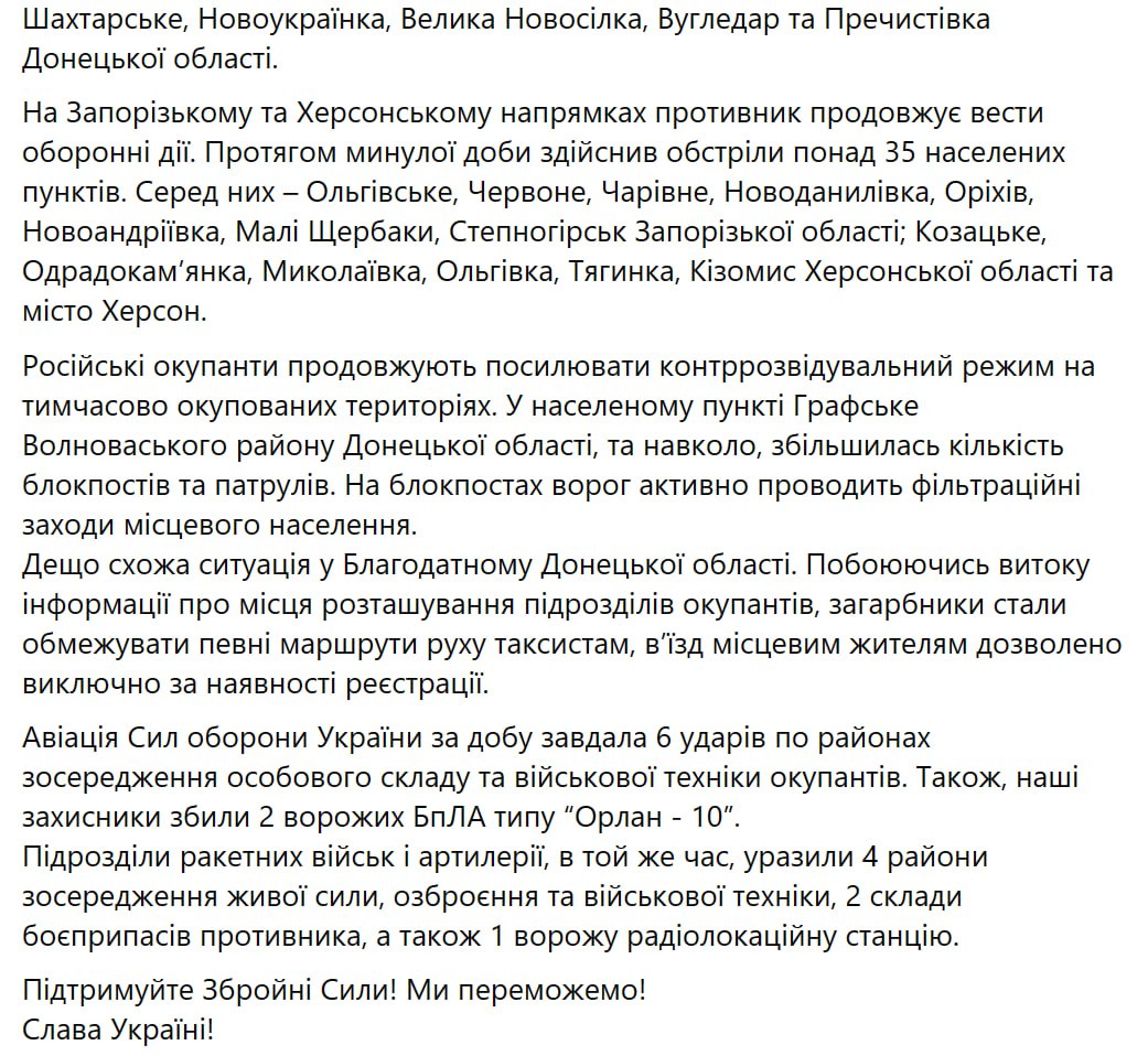 Про це йдеться у ранковому зведенні Генштабу ЗСУ.