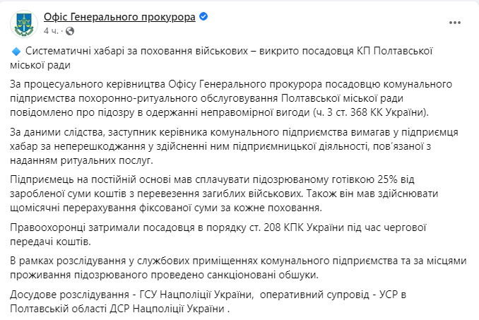 Співробітника полтавського похоронно-ритуального підприємства комунальної власності підозрюють у систематичному отриманні хабарів за перевезення тіл та поховання загиблих українських військових.