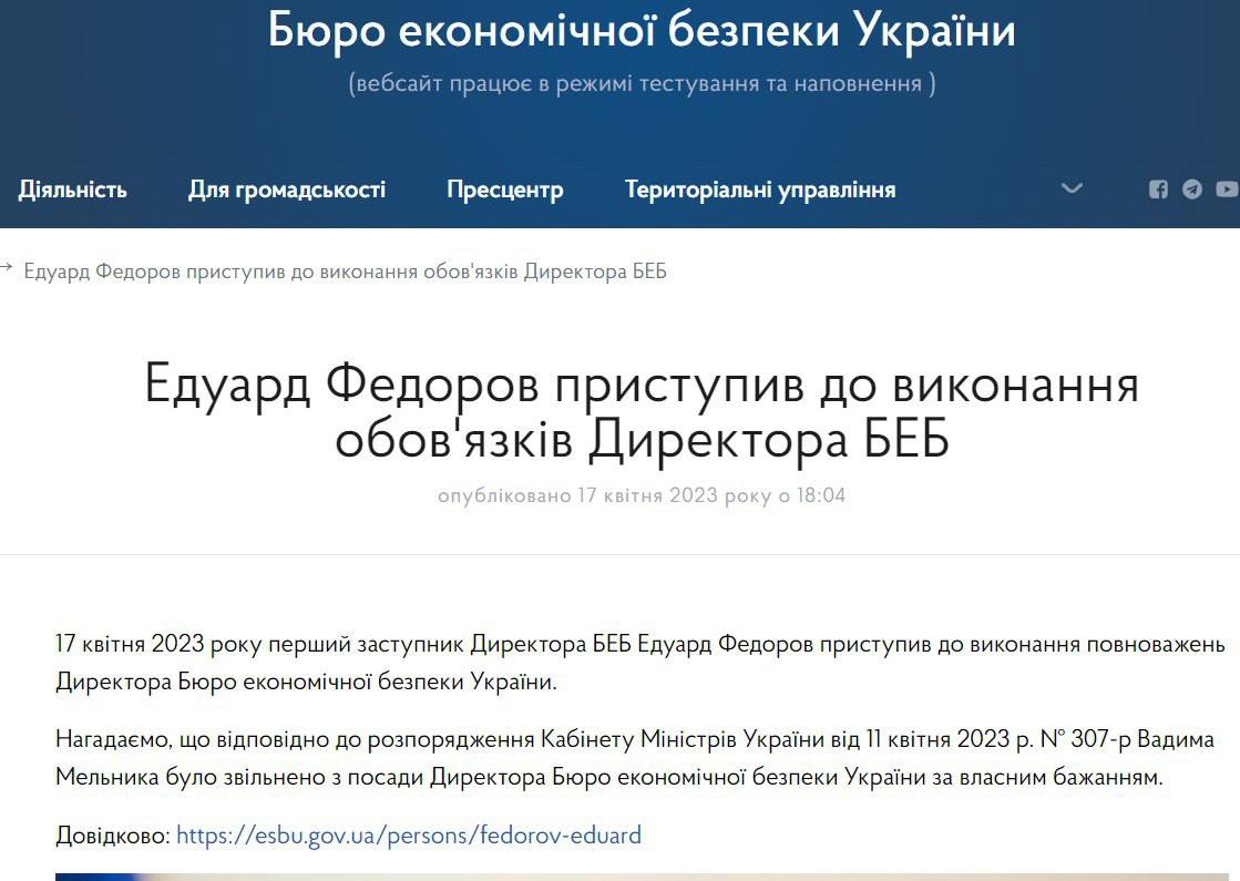 Перший заступник директора Бюро економічної безпеки Едуард Федоров розпочав виконання повноважень директора ВЕБ.