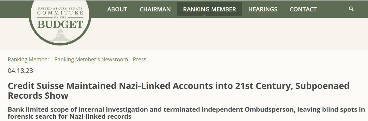 "Credit Suisse, мабуть, вів рахунки, переважна більшість яких раніше не розголошувалося, принаймні 99 осіб, які були високопоставленими нацистськими чиновниками в Німеччині, або членами пов'язаних з нацистами угруповань в Аргентині.
