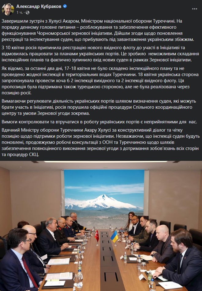 "Завершили зустріч із Хулусі Акаром, Міністром національної оборони Туреччини. На порядку денному головне питання - розблокування та забезпечення ефективного функціонування Чорноморської зернової ініціативи. Прийшли згоди щодо відновлення реєстрації та інспектування суден, що прибувають під завантаження українським зерном", - повідомив він.