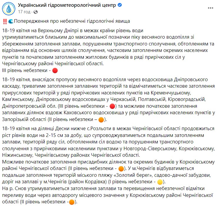Затоплення заплавних територій та часткове затоплення прируслових територій внаслідок пропуску весняної повені очікується у прирічних населених пунктах на Кременчуцькому, Кам'янському, Дніпровському водосховищах (також III рівень небезпеки).
