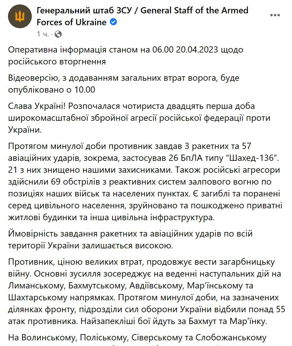 ЗСУ відбили понад 55 атак противника. Також минулої доби росіяни застосували 26 "Шахідів", 21 з них знищено.