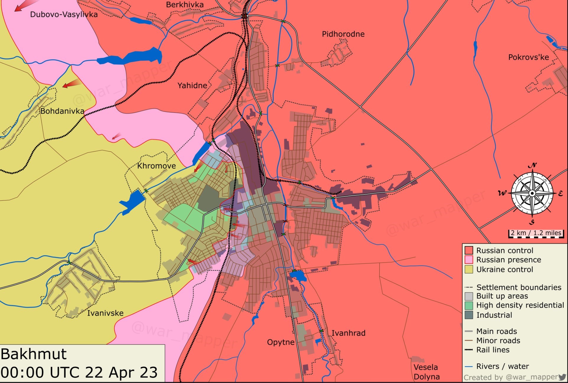 "Інститут вивчення війни" повідомляє, що сили "Вагнера", ймовірно, захопили залізничну станцію Бахмут-2 у центрі міста. Також вони просунулися на захід від залізничної гілки поряд зі станцією та підійшли до гілки на південь від станції.