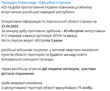 Російські військові продовжують обстріли в Херсонській області, за минулу добу зафіксовано 83 обстріли з боку ворога. Внаслідок ворожих атак загинули двоє людей, шестеро отримали поранення.