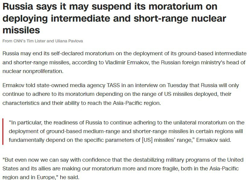 За його словами, Росія продовжуватиме дотримуватися свого мораторію лише в залежності від дальності розгорнутих американських ракет, їх характеристик та їх здатності досягти Азіатсько-Тихоокеанського регіону.