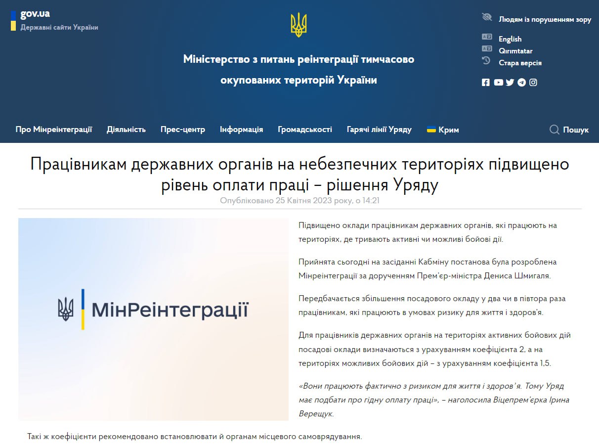 "Вони працюють фактично з ризиком для життя та здоров'я. Тому уряд має подбати про гідну оплату праці", - заявила віце-прем'єр-міністр - міністр з питань реінтеграції тимчасово окупованих територій Ірина Верещук.