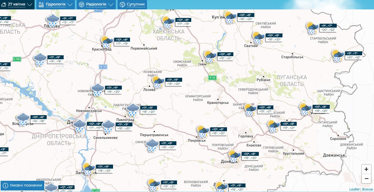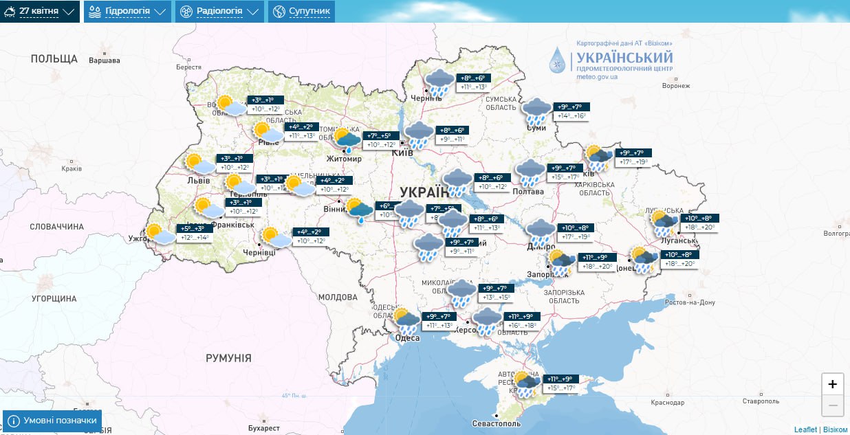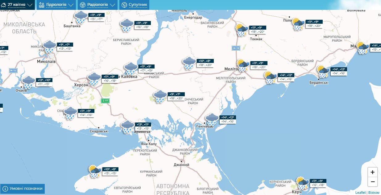 Сильні опади сьогодні очікуються на півдні - на Одещині та Миколаївщині, а вже завтра, 27 квітня, короткочасні зливи накриють Херсонську область.