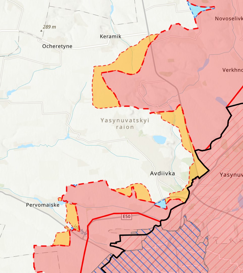 "Інститут вивчення війни" пише про те, що російські сили досягли обмежених успіхів на захід від траси Донецьк-Слов'янськ приблизно за 10 кілометрів на північ від Авдіївки.