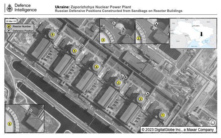Також РФ, за даними британської розвідки, розмістила мішки із піском на дахах реакторів Запорізької АЕС. Це перший випадок використання таких фортифікацій на дахах реакторів.