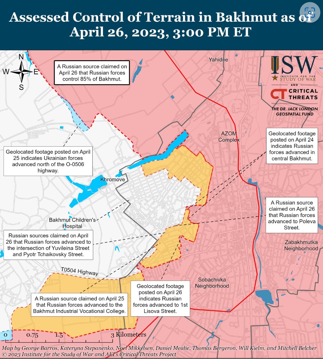 На кадрах, проаналізованих Інститутом вивчення війни, видно, що російські війська просунулися до вулиці Перша Лісова в західній частині Бахмута (за кілька кварталів від вулиць Ювілейної, що веде в Хромово).