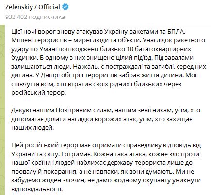 "Внаслідок ракетного удару по Умані пошкоджено близько 10 багатоквартирних будинків. В одному з них знищено цілий під'їзд. Під завалами залишаються люди. На жаль, є постраждалі та загиблі, зокрема дитина", - написав Зеленський.