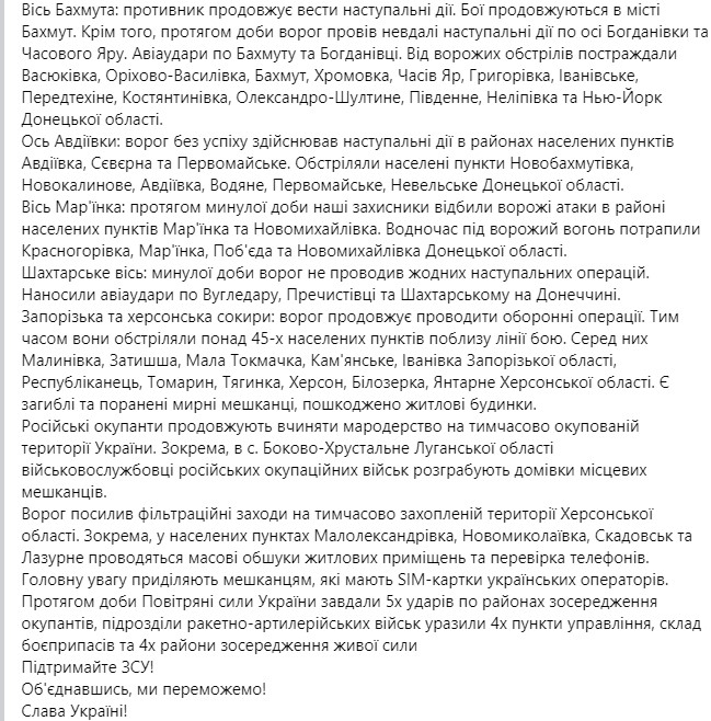 Під Бахмутом були атаки проти Богданівки та Часів Яру. Там же наносилися авіаудари, під які потрапив Бахмут,