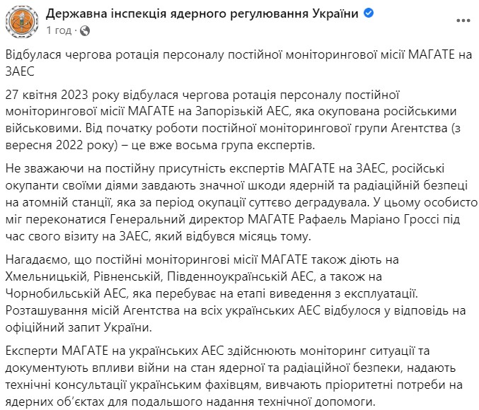 У понеділок, 1 травня, відбулася чергова ротація персоналу постійної моніторингової місії Міжнародного агентства з атомної енергії (МАГАТЕ) на окупованій Запорізькій АЕС.