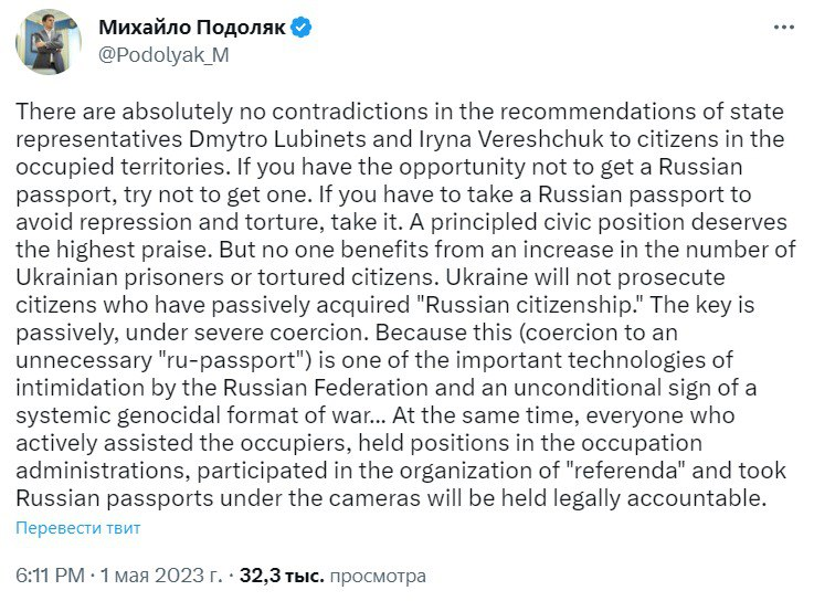 Радник глави Офісу президента України Михайло Подоляк прокоментував здобуття українцями громадянства РФ на непідконтрольних територіях.