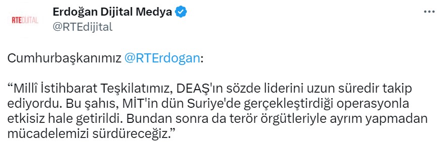 "Національна розвідка Туреччини довго стежила за лідером "ІДІЛ" Абу Хусейном Аль-Курейші. Ця людина була вбита вчора в Сирії під час операції, яку провела турецька розвідка", - йдеться у повідомленні Ердогана.