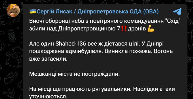 08.00 У Дніпрі був приліт "Шахіда" адміністративною будівлею, повідомив губернатор Сергій Лисак.
