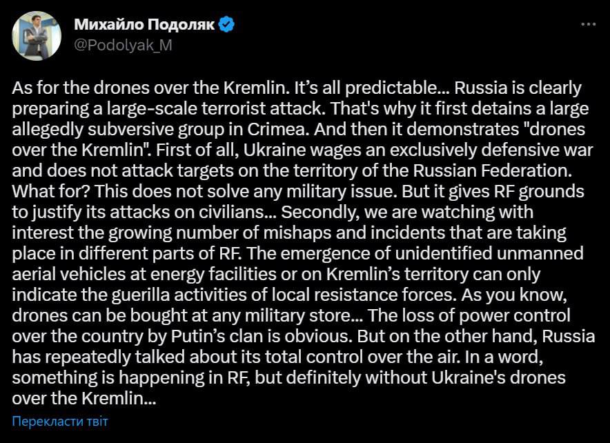 20:26 Атака БПЛА на Кремль могла бути організована російською владою для «мотивації суспільства» та звинувачення України «у якихось злочинах».