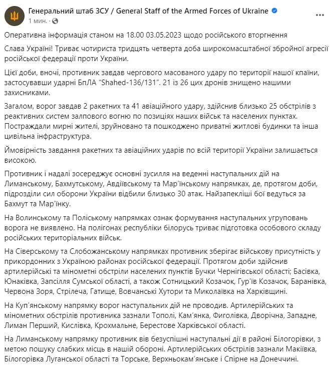 1. Сьогодні вночі РФ атакувала ударними дронами-камікадзе "Shahed-136/131". Інформація про наслідки цієї атаки уточнюється.