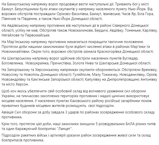 3. Противник продовжує вести наступ на Лиманському, Бахмутському, Авдіївському та Мар'їнському напрямках – там відбили більше 30 атак. В епіцентрі бойових дій залишаються Бахмут та Мар'їнка.