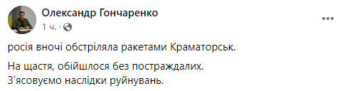 Наслідки обстрілу Краматорська. Фото: facebook.com/alexander.vasilyevich.goncharenko