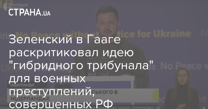 Президент України Володимир Зеленський, виступаючи в Гаазі, закликав створити повноцінний міжнародний трибунал зі скоєних Росією військових злочинів, і розкритикував ідею формату "гібридного трибуналу", який раніше пропонували створити США.