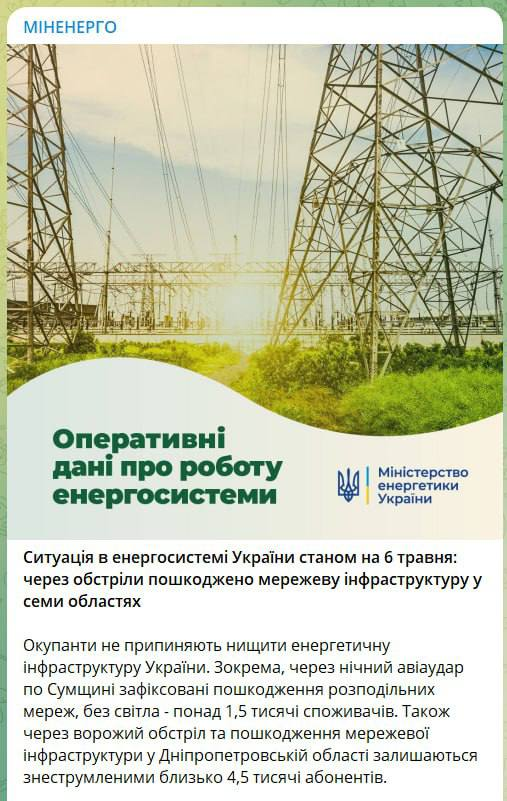 "Зокрема, через нічний авіауда по Сумщині зафіксовано пошкодження розподільчих мереж, без світла - понад 1,5 тисячі споживачів", - пише прес-служба міністерства.