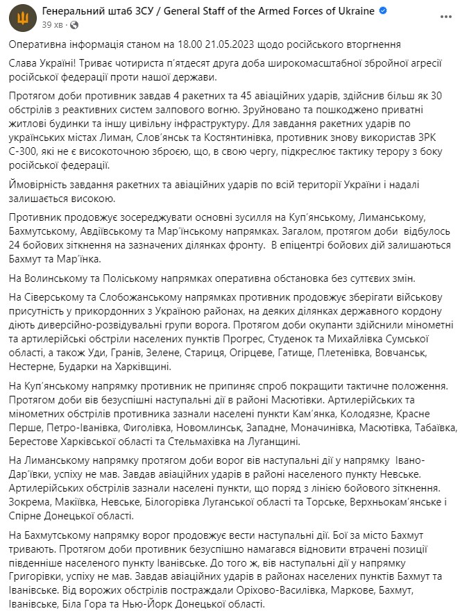 Подробиці про вчорашні військові події читайте у підсумках за 20 травня : "Чи захоплений Бахмут і які будуть наслідки, прильоти в Маріуполі, коли Україна отримає F-16".