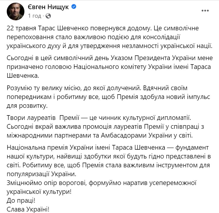 На своїй сторінці у Фейсбуці Ніщук подякував Зеленському та пообіцяв "робити все, щоб Премія стала важливим інструментом для популяризації України".
