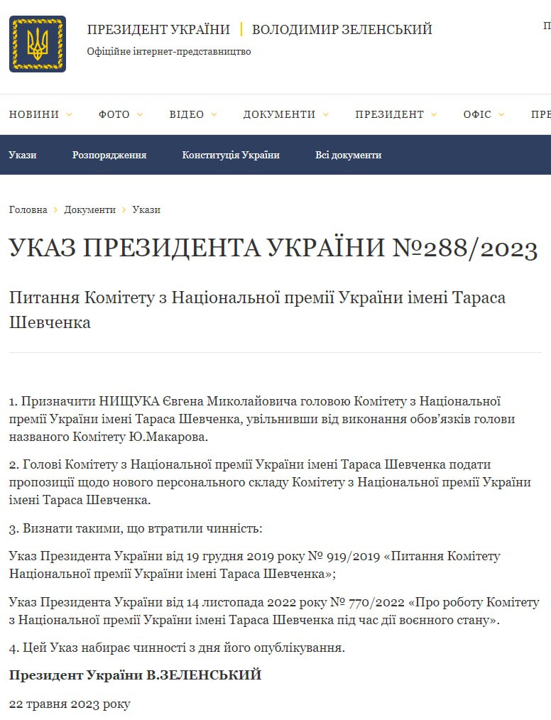 Крім того, Ніщуку, згідно з документом, доручено подати пропозиції щодо нового персонального складу Комітету Шевченківської премії.