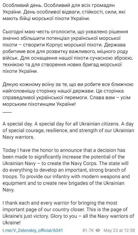 "Щодня на полі бою українська морська піхота доводить, що вона потужна сила, яка знищує ворога, звільняє українські землі, виконує найскладніші завдання у найскладніших умовах. І нам потрібно більше такої сили. Тому з сьогоднішнього дня ми значно збільшуємо потенціал морської піхоти та створюємо корпус морської піхоти", - заявив Зеленський.