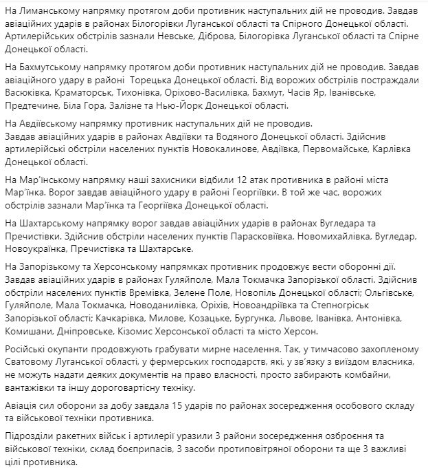 Зазначимо, що вперше у зведенні не повідомляється, що росіяни наступали на напрямі Бахмуту.