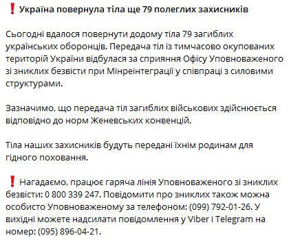 У міністерстві повідомили, що передача тіл загиблих військових здійснювалася відповідно до норм Женевських конвенцій. Тіла захисників будуть передані їхнім сім'ям для гідного поховання.